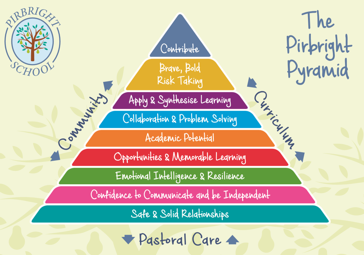 At Pirbright Village Primary School, we begin our curriculum design with the National Curriculum objectives and build from there. We are passionate about providing all children with opportunities for them to excel and have the highest aspirations for success. Key to this is children having strong building blocks to ensure that children reach (and exceed!) their academic potential. In order for the children to even contemplate true learning (and we mean embedded & deep learning which they can begin to apply to other settings – not just rote regurgitation), they need to start from the bottom of The Pirbright Pyramid and work up.